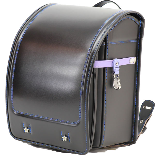 岐阜横山鞄のランドセルです。品番h2bkm-cの斜め前側です。黒×青色の牛革と人工皮革のハイブリッドで手作りされたランドセルです。