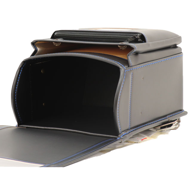 岐阜横山鞄のランドセルです。品番h2bkm-fの内側です。黒×青色の牛革と人工皮革のハイブリッドで手作りされたランドセルです。