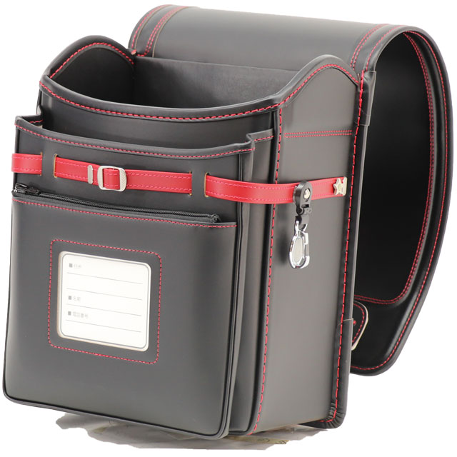 岐阜横山鞄のランドセルです。品番h2bkr-cのセレクトデザインの前段です。黒×赤色の牛革と人工皮革のハイブリッドで手作りされたランドセルです。