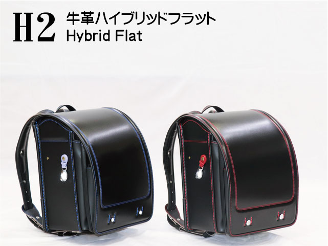 岐阜横山鞄オリジナルランドセルH2Fシリーズのバナーです。素材は牛革+人工皮革、デザインはフラットタイプ、ST型ベルトとウイング背カンの組合せで、本体カラーは2色です。