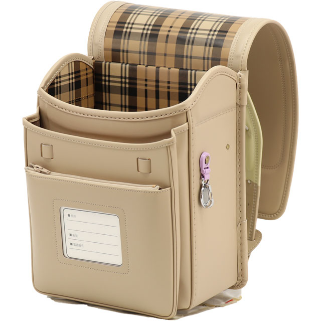 岐阜横山鞄のランドセルです。品番m4be-fのフラットデザインの前段です。ベージュ色の人工皮革で手作りされたランドセルです。