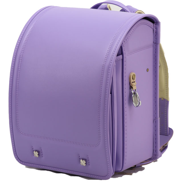 岐阜横山鞄のランドセルです。品番m4ir-fの斜め前側です。アイリス色の人工皮革で手作りされ、ランドセルです。