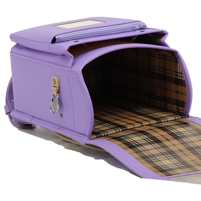 岐阜横山鞄のランドセルです。品番m4ir-fの内側です。アイリス色の人工皮革で手作りされたランドセルです。