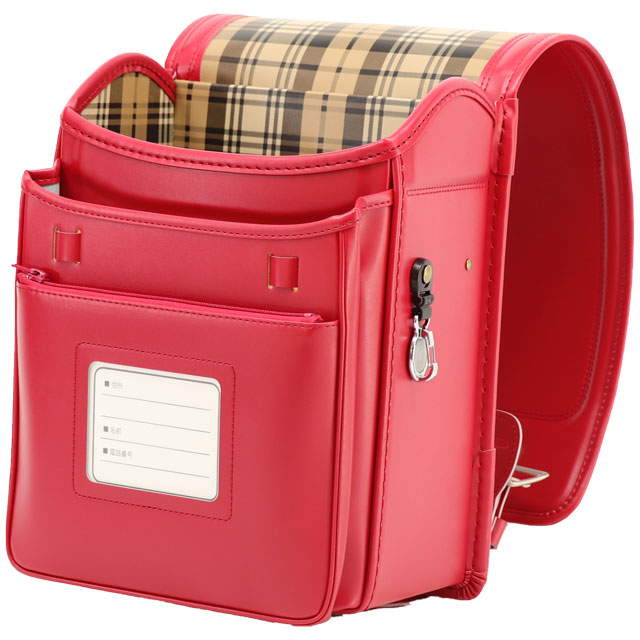 岐阜横山鞄のランドセルです。品番m4rc-fのフラットデザインの前段です。レッド色の人工皮革で手作りされたランドセルです。