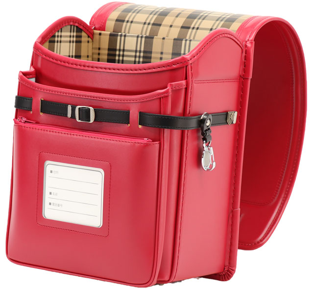 岐阜横山鞄のランドセルです。品番m4rc-cのセレクトデザインの前段です。レッド色の人工皮革で手作りされたランドセルです。