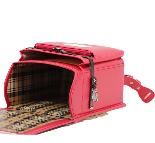 岐阜横山鞄のランドセルです。品番m4rc-cの内側です。レッド色の人工皮革で手作りされたランドセルです。