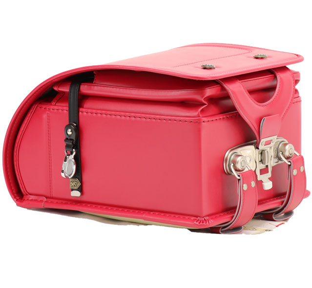 岐阜横山鞄のランドセルです。品番m4rc-cの底側です。レッド色の人工皮革で手作りされたランドセルです。