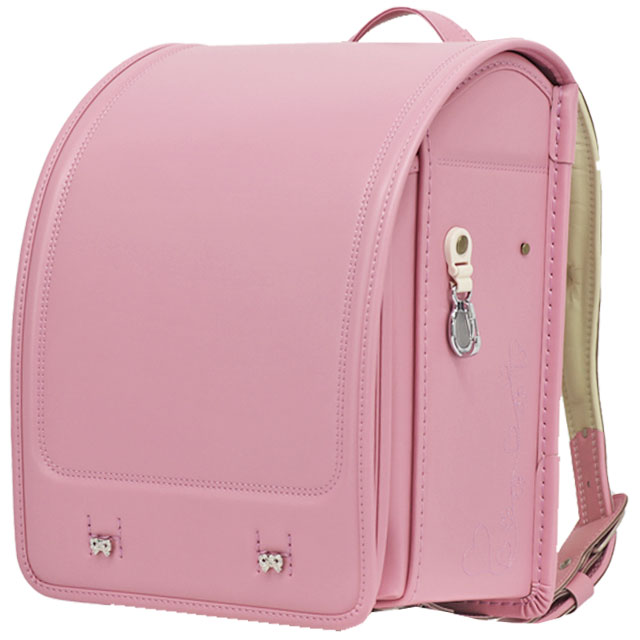岐阜横山鞄のランドセルです。品番m5fp-fの斜め前側です。フェアリーピンク色の人工皮革で手作りされ、ランドセルです。